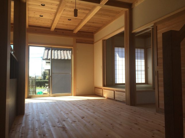 天竜のスギ・ヒノキを、内装・構造・下地材へ使用しています。 一階は、桧のフローリング、杉の天井、しっくいの壁、と自然素材を使用した居心地の良い空間です。